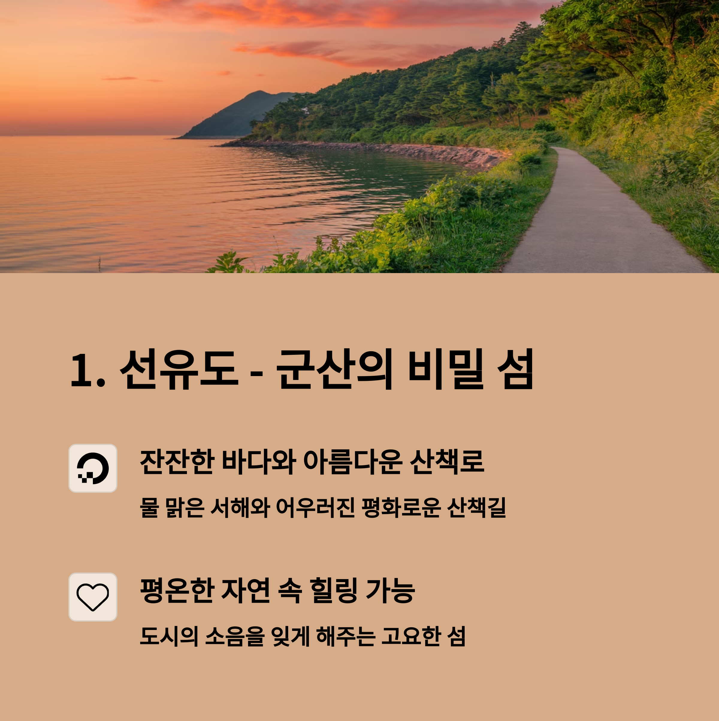 섬 곳곳에 산책로가 잘 조성돼 있어 혼자 천천히 걸으며 자연을 만끽하기 좋아요. 카페에 앉아 바다를 바라보며 커피 한 잔을 즐기다 보면, 한국 속담 “고요 속에 깃든 평화”가 딱 떠오릅니다. 혼자 여행하면서도 외롭지 않은 이유는 이곳의 따뜻한 분위기 덕분이죠. 접근성도 나쁘지 않아 군산에서 배로 1시간 남짓이면 도착합니다. “여행은 새로운 장소를 보는 게 아니라 새로운 눈으로 보는 것”이라는 마르셀 프루스트의 명언처럼, 선유도는 당신에게 새로운 시선을 선물할 거예요.