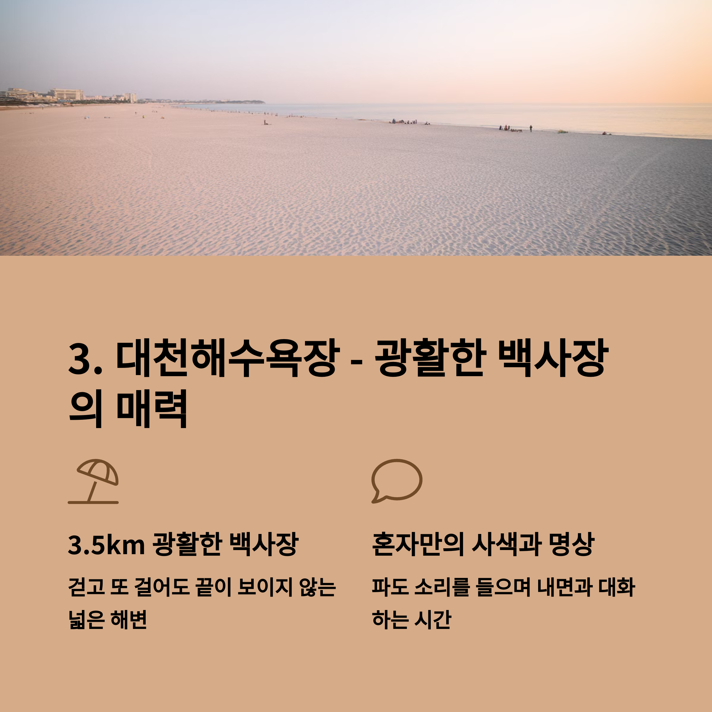 해변 산책로를 따라 걷거나, 파도 소리를 들으며 잠시 앉아 있으면 영화 이터널 선샤인의 대사 “바다는 모든 것을 받아들이고 치유한다”가 떠오릅니다. 주변에 맛집과 편의시설도 많아 혼자 여행해도 불편함이 없어요. 혼자만의 사색을 즐기고 싶다면, 대천해수욕장은 놓칠 수 없는 선택입니다.
