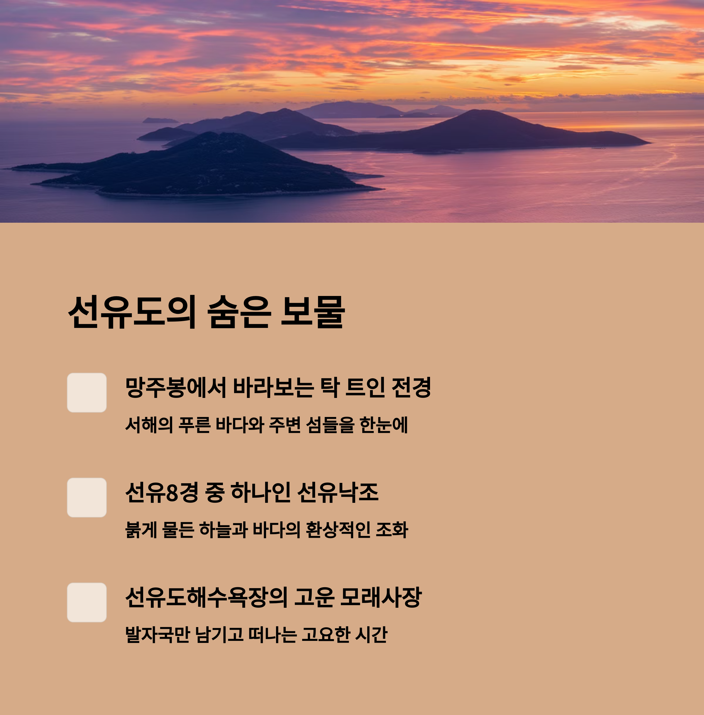 교통 체크: 예를 들어, 선유도는 배 시간이 한정적이니 미리 확인 필수!