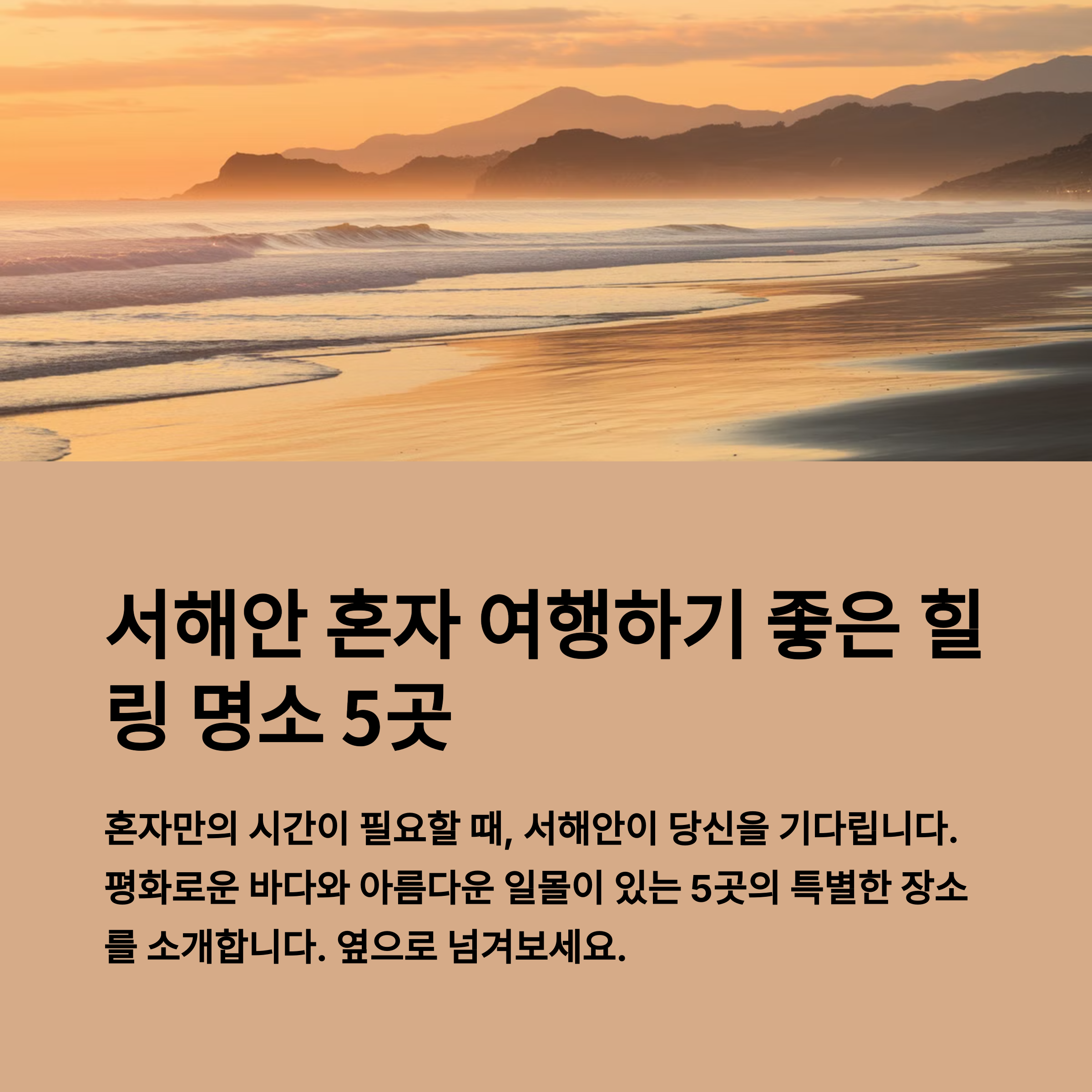 혼자 떠나는 여행은 일상에서 벗어나 자신을 돌아보고 마음을 재충전할 기회입니다. 특히 서해안은 매혹적인 자연 경관과 평온한 분위기로 혼자 여행하기에 더없이 좋은 곳들이 많죠.