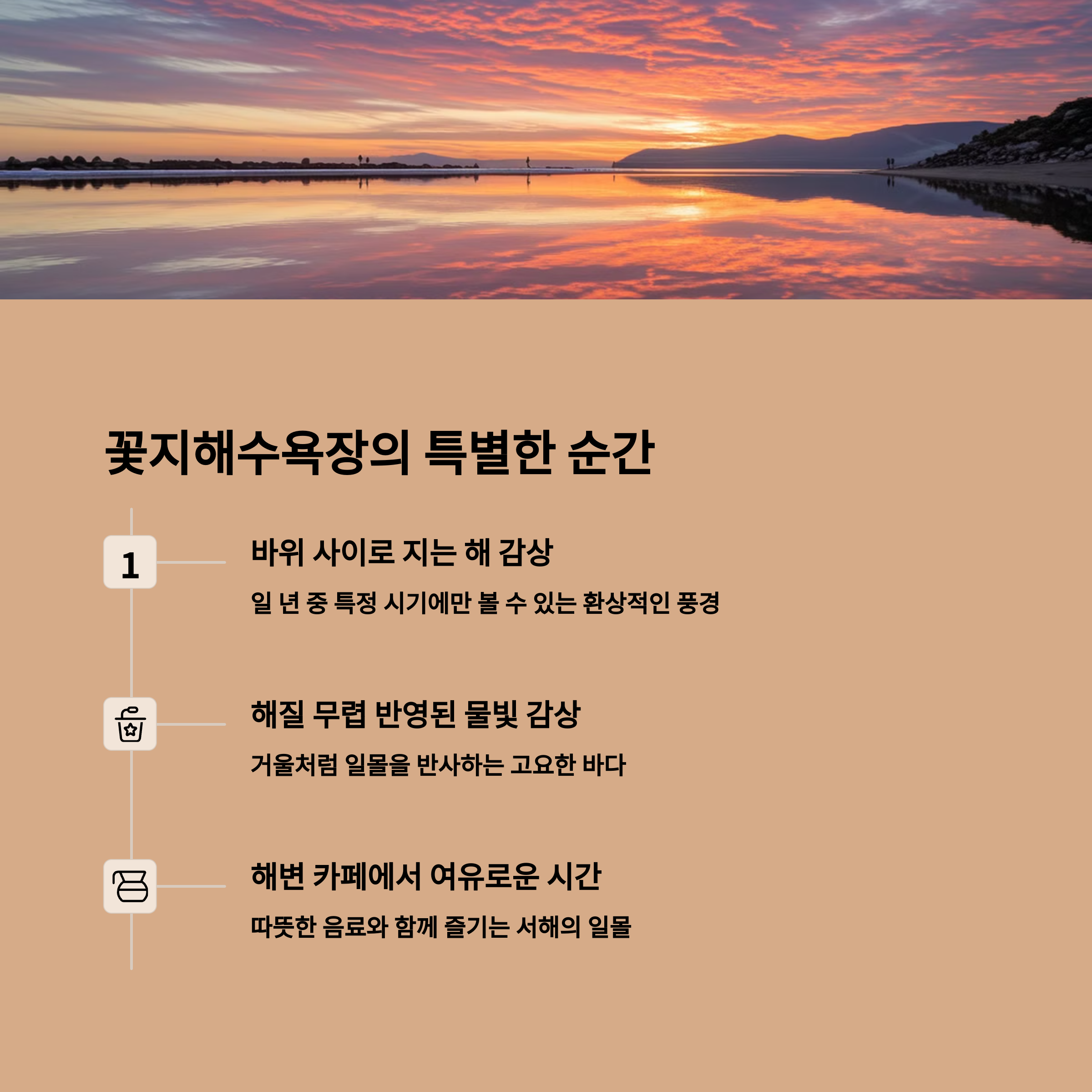 태안의 꽃지해수욕장은 서해안에서 일몰이 가장 눈부신 곳으로 꼽힙니다. 태안군 조사에 따르면, 이곳의 일몰을 보기 위해 매년 50만 명 이상이 방문한다고 해요. 저도 석양이 물드는 할미바위와 할아비바위를 배경으로 사진을 찍으며 감탄을 멈출 수 없었죠. 해변에 앉아 붉은 하늘을 바라보는데, “일몰은 하루의 끝이 아니라 새로운 시작을 알리는 신호”라는 말이 절로 떠오르더라고요.