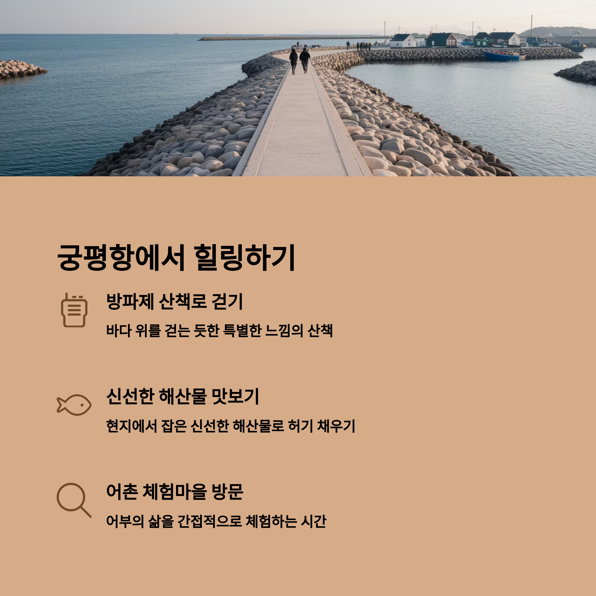 특히 차박이나 캠핑을 즐기기 좋아, 텐트를 치고 밤바다를 감상한 적이 있는데, 그 여유로움이 아직도 기억에 남아요. 주변에 해산물 맛집이 많아 혼자 신선한 회 한 접시를 즐기며 “여행은 배고프면 맛집, 졸리면 잠”이라는 유머 섞인 깨달음을 얻기도 했죠. 접근성과 자연의 조화가 돋보이는 궁평항, 꼭 한번 들러보세요.