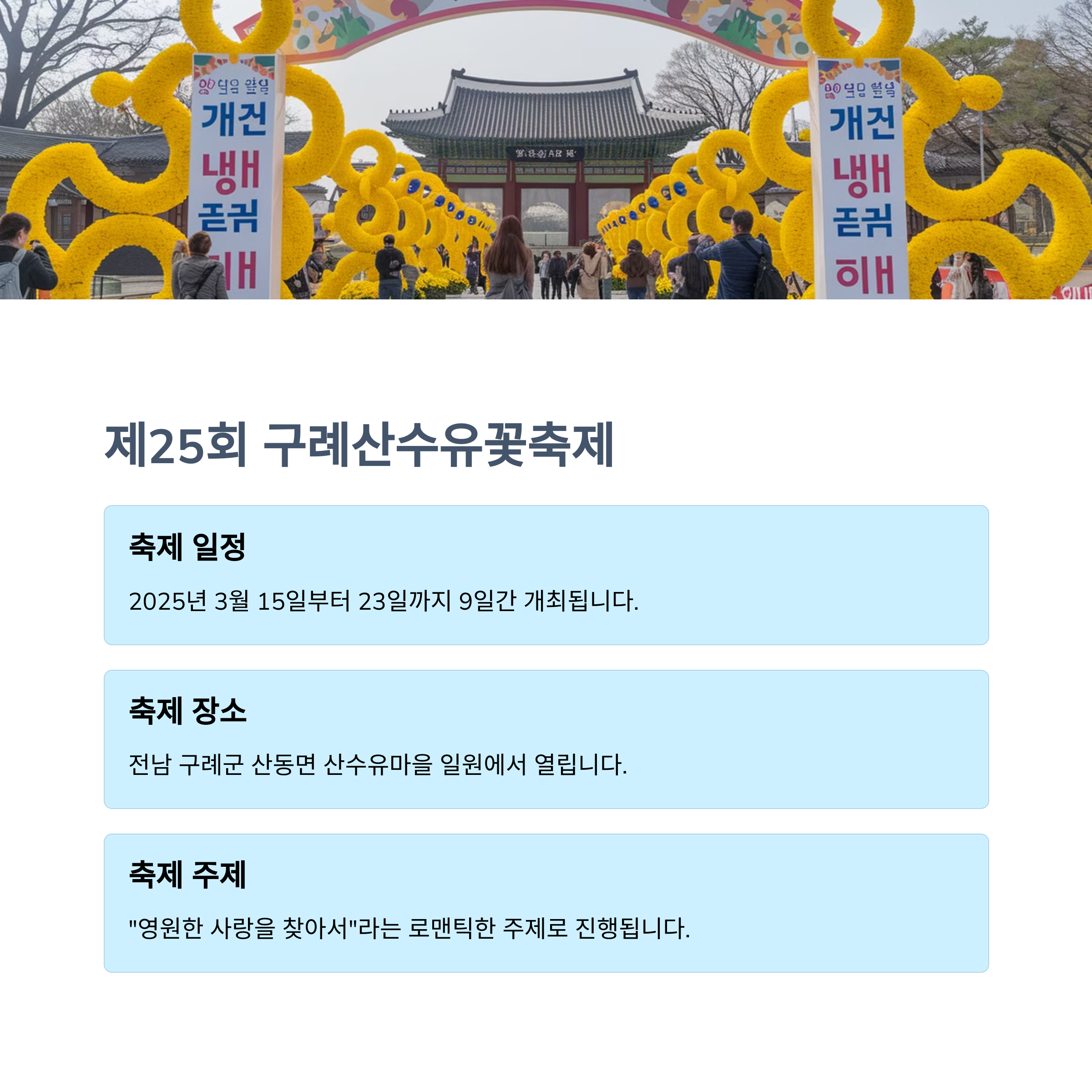 전남 구례군 산동면에 위치한 산수유마을은 '영원한 사랑을 찾아서'라는 주제로 2025년 3월 15일부터 23일까지 '구례산수유꽃축제'가 개최됩니다. 이 축제는 대한민국을 대표하는 봄꽃축제로, 산수유꽃은 3월에 다른 꽃보다 먼저 개화해 봄 소식을 가장 먼저 전하는 특징이 있습니다.