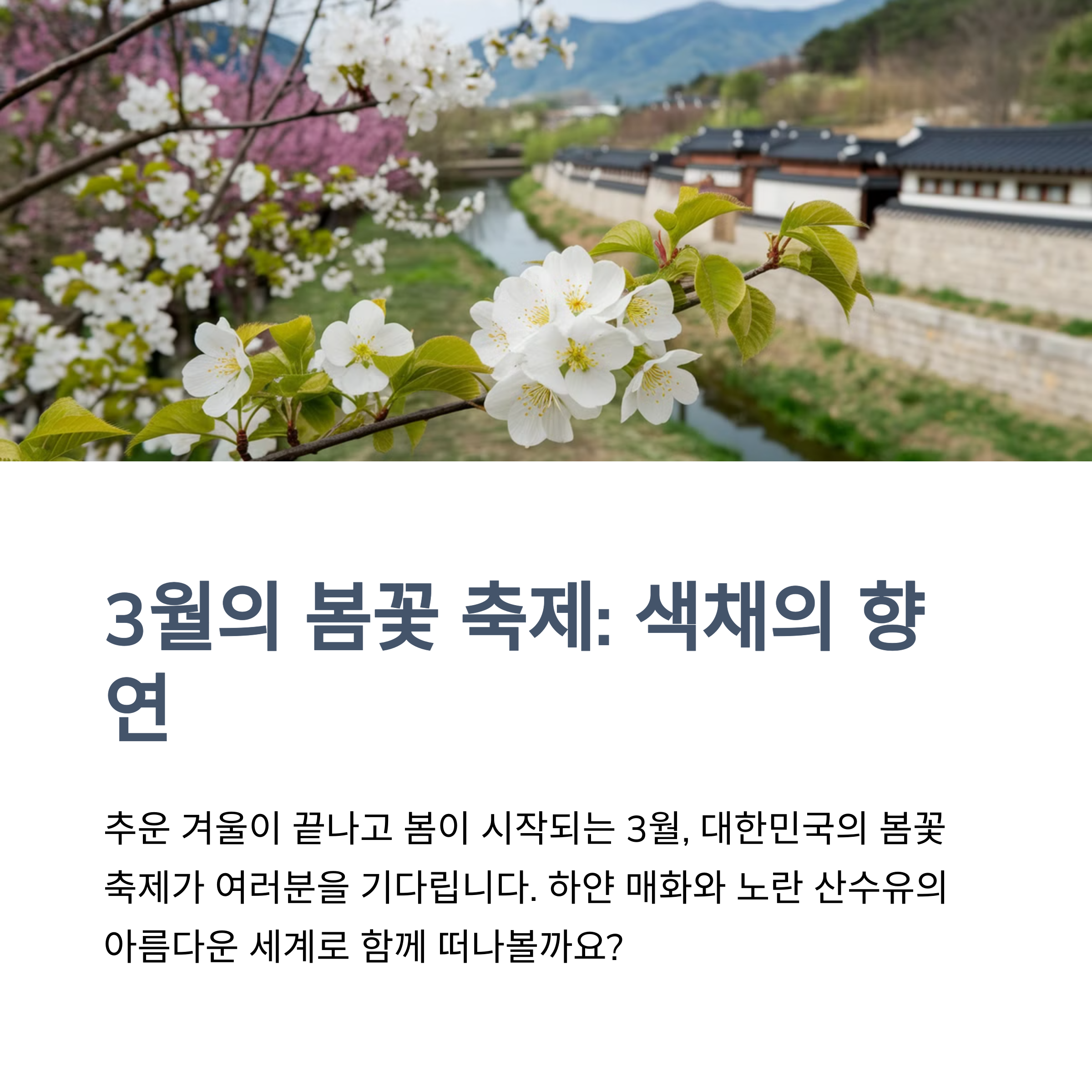 "꽃샘추위에 매화 향기 더 짙어진다"라는 말이 있듯이, 3월은 겨울의 끝자락에서 봄의 시작을 알리는 꽃들이 저마다의 아름다움을 뽐내는 시기입니다. 한국관광공사의 2023년 조사에 따르면, 국내 여행객 중 27%가 '꽃 구경'을 봄철 여행의 주요 목적으로 꼽았다고 합니다.
