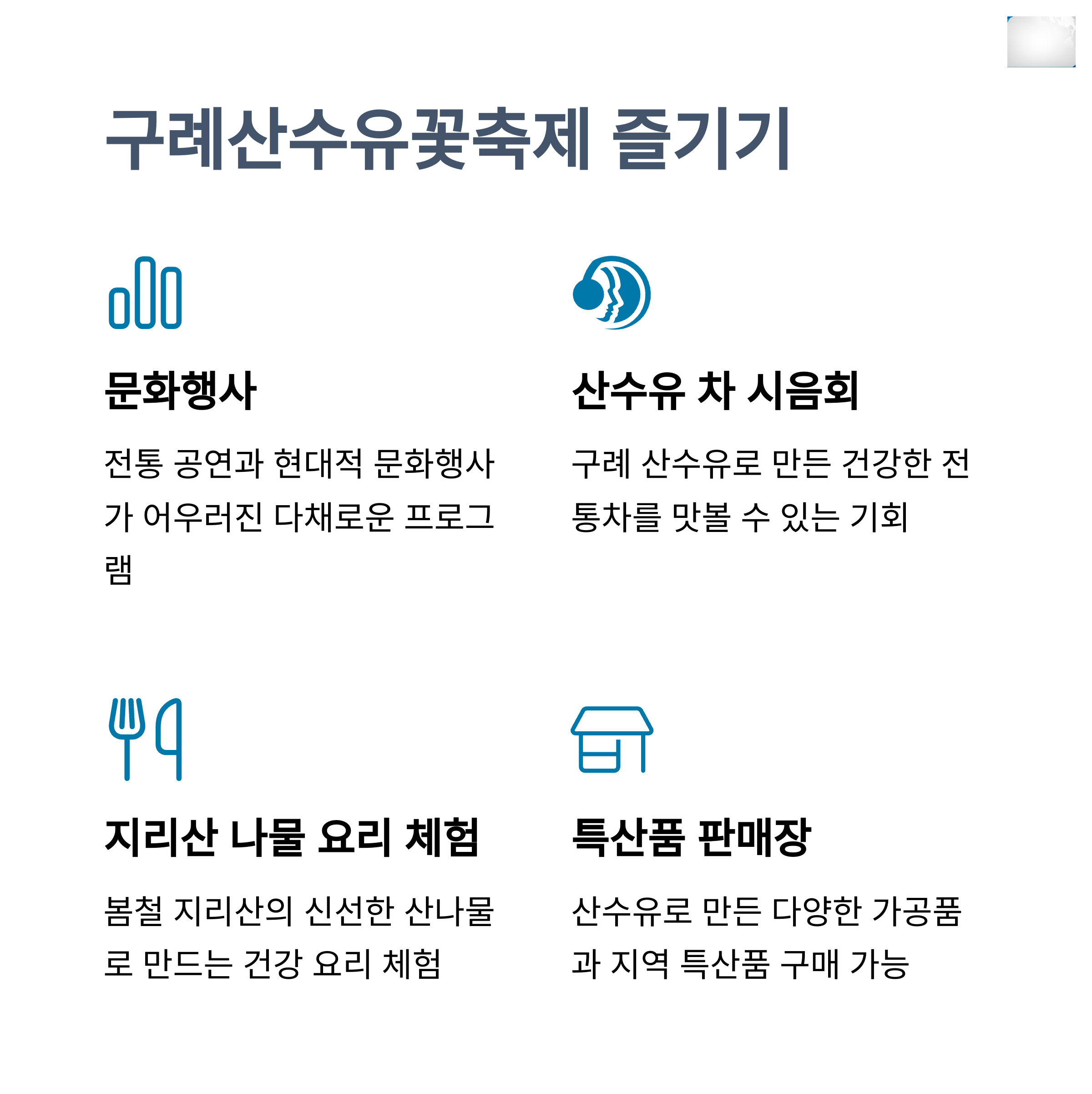 산수유꽃은 개화 후 일주일 정도만 감상할 수 있어, 개화 소식을 확인한 후 방문하는 것이 좋습니다. 축제 기간 중 기온은 최저 1°C, 최고 8°C로 예상되니 따뜻한 옷차림을 준비하시면 좋겠습니다. 축제에 관한 더 자세한 정보는 구례산수유꽃축제추진위원회(061-780-2390)로 문의하실 수 있습니다.