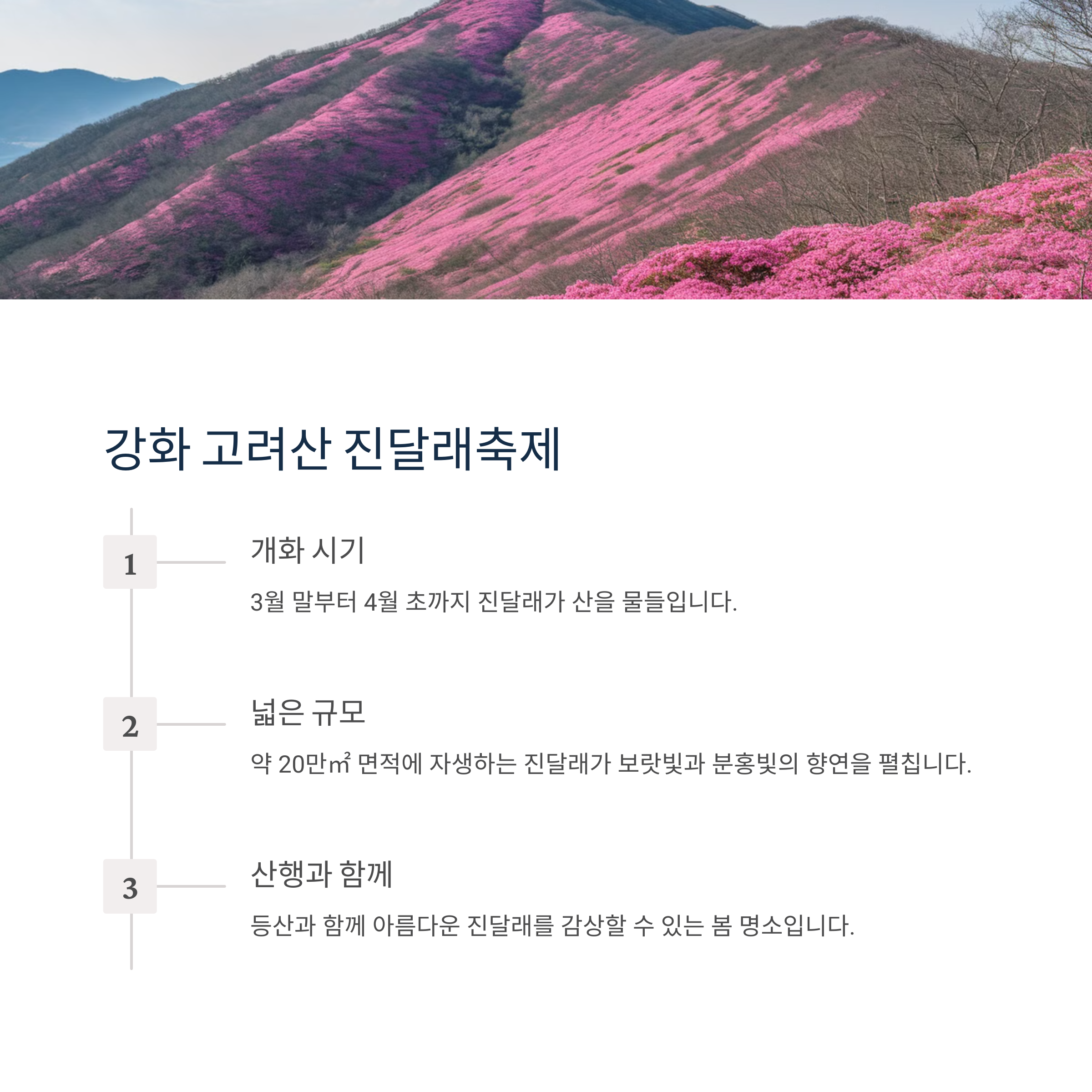 인천 강화군에 위치한 고려산은 3월 말부터 4월 초까지 약 20만㎡ 면적에 자생하는 진달래가 개화하는 명소입니다. 매년 개최되는 '고려산 진달래축제'는 작년 기준 약 15만 명의 방문객이 찾았습니다.