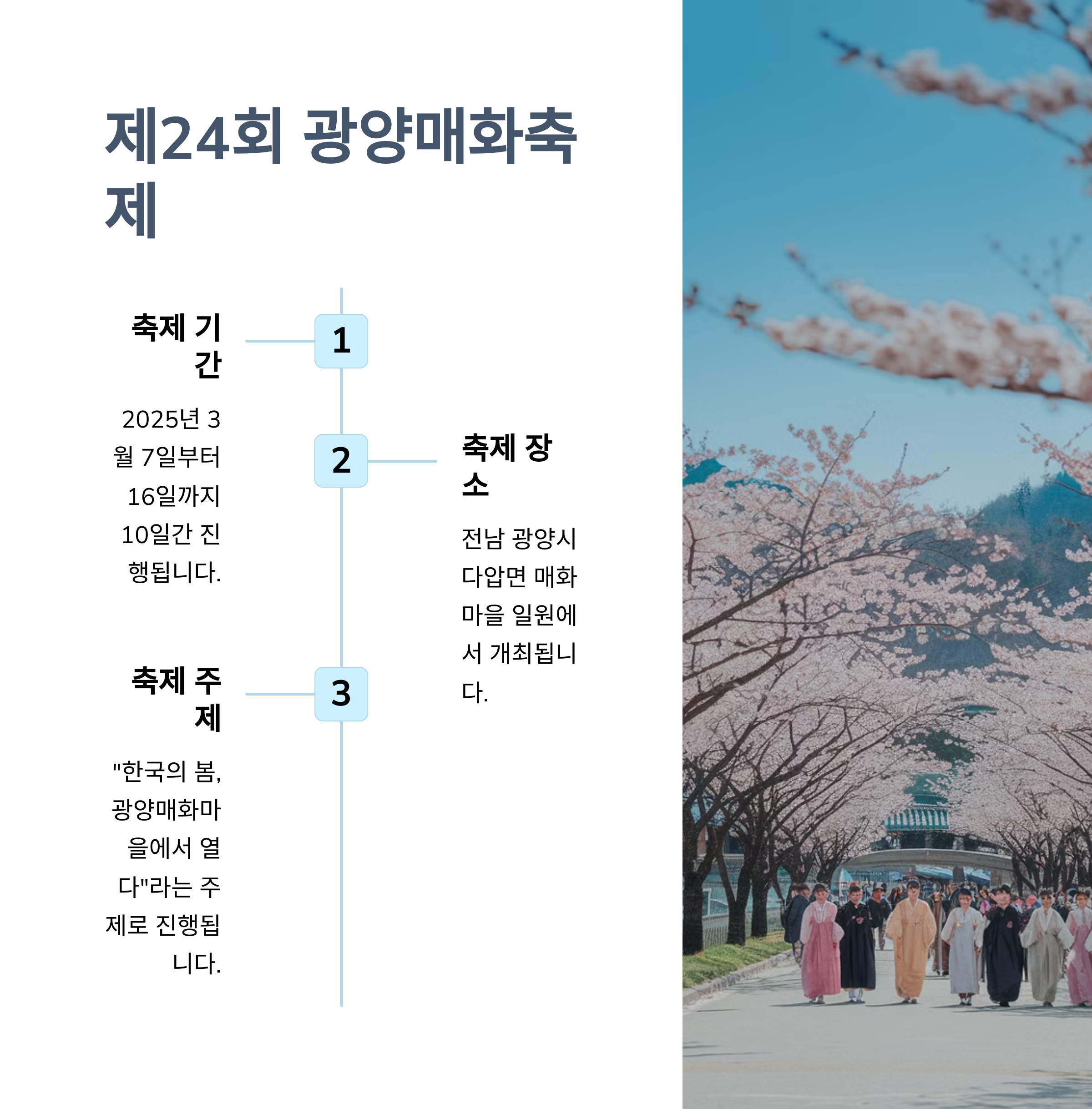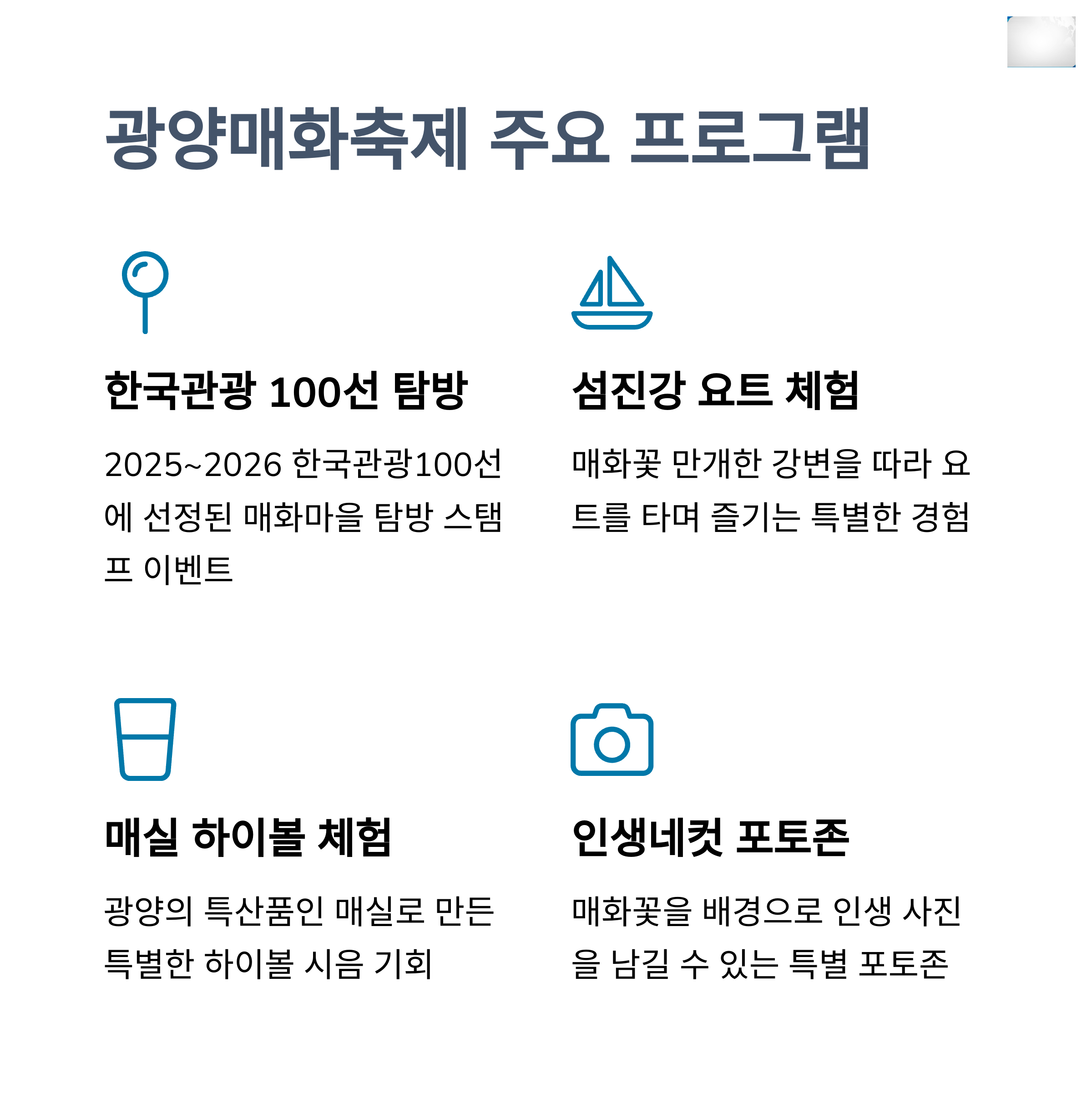 '한국의 봄, 광양매화마을에서 열다'라는 주제와 '매화 피는 순간, 봄이 오는 시간'이라는 슬로건 아래 차별화된 프로그램이 준비되어 있습니다. 특히 올해는 2025~2026 한국관광100선에 광양매화마을이 2013년에 이어 2회 선정된 것을 기념하여 한국관광 100선 탐방 이벤트, 매돌이랜드 체험존, 매돌이 굿즈샵, 매화랑 2박 3일 등 광양매화축제에서만 즐길 수 있는 특별한 콘텐츠가 대거 도입됩니다.