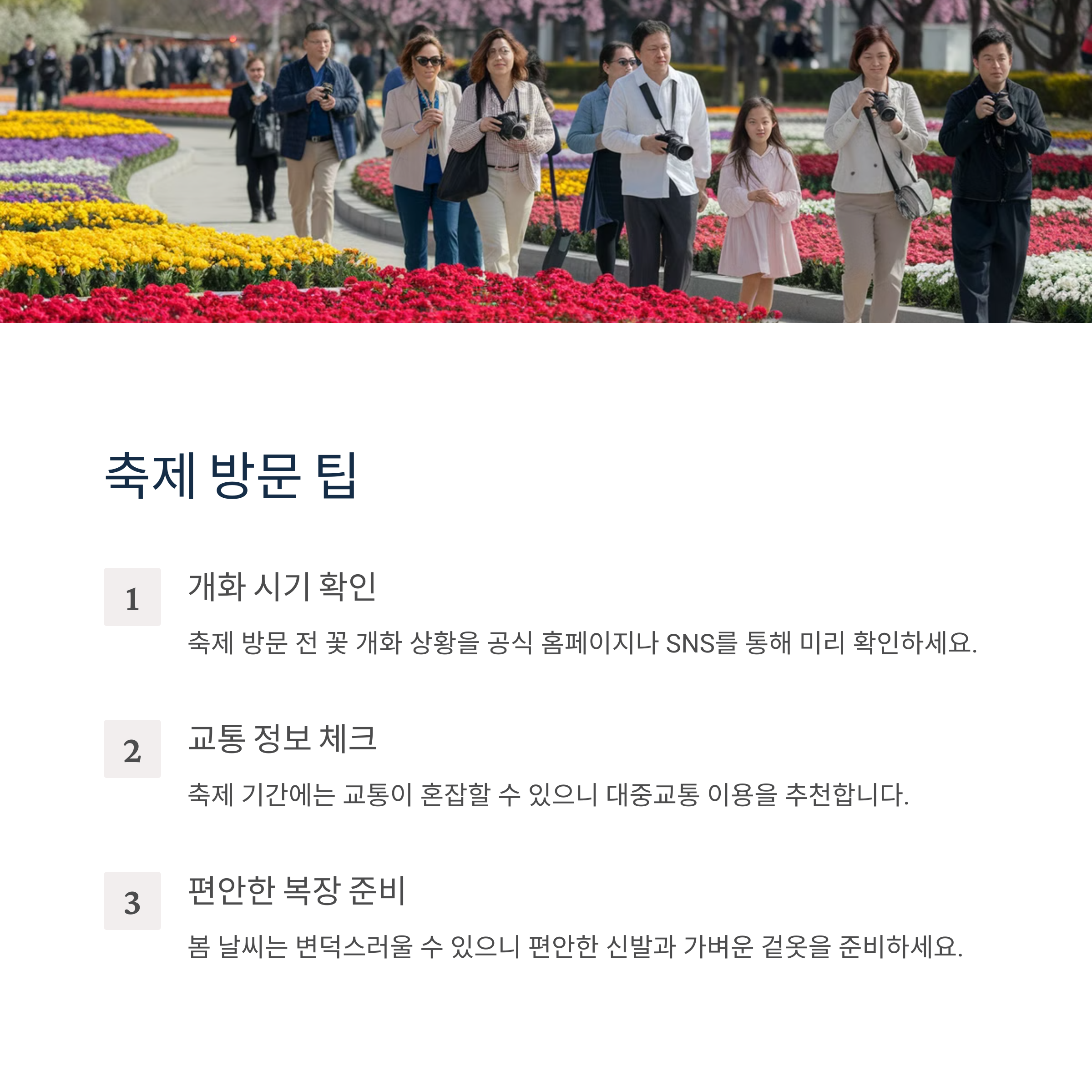 봄꽃 여행을 계획하실 때는 몇 가지 유의사항을 확인하시면 더욱 즐거운 여행이 될 것입니다. 먼저, 개화 시기는 기후 조건에 따라 변동될 수 있으니 방문 전 축제 공식 홈페이지나 SNS를 통해 개화 상황을 확인하세요. 또한, 주말과 공휴일은 혼잡하기 때문에 가능하다면 평일 방문을 추천합니다.