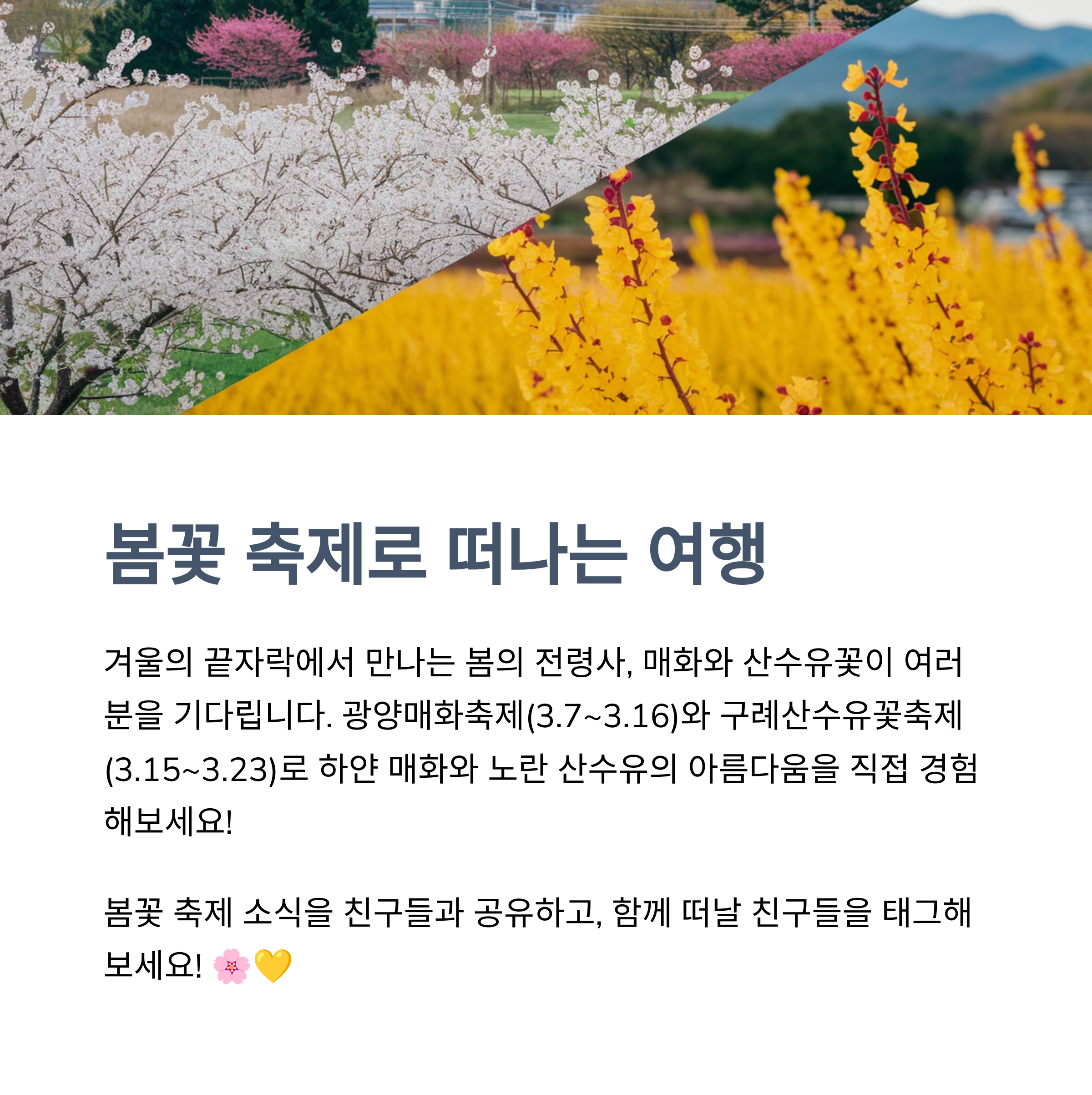지금부터 "백문이 불여일견(百聞不如一見)"이라는 말처럼, 직접 눈으로 보아야 그 진가를 알 수 있는 3월의 아름다운 봄꽃 축제 명소들을 소개해 드리겠습니다.