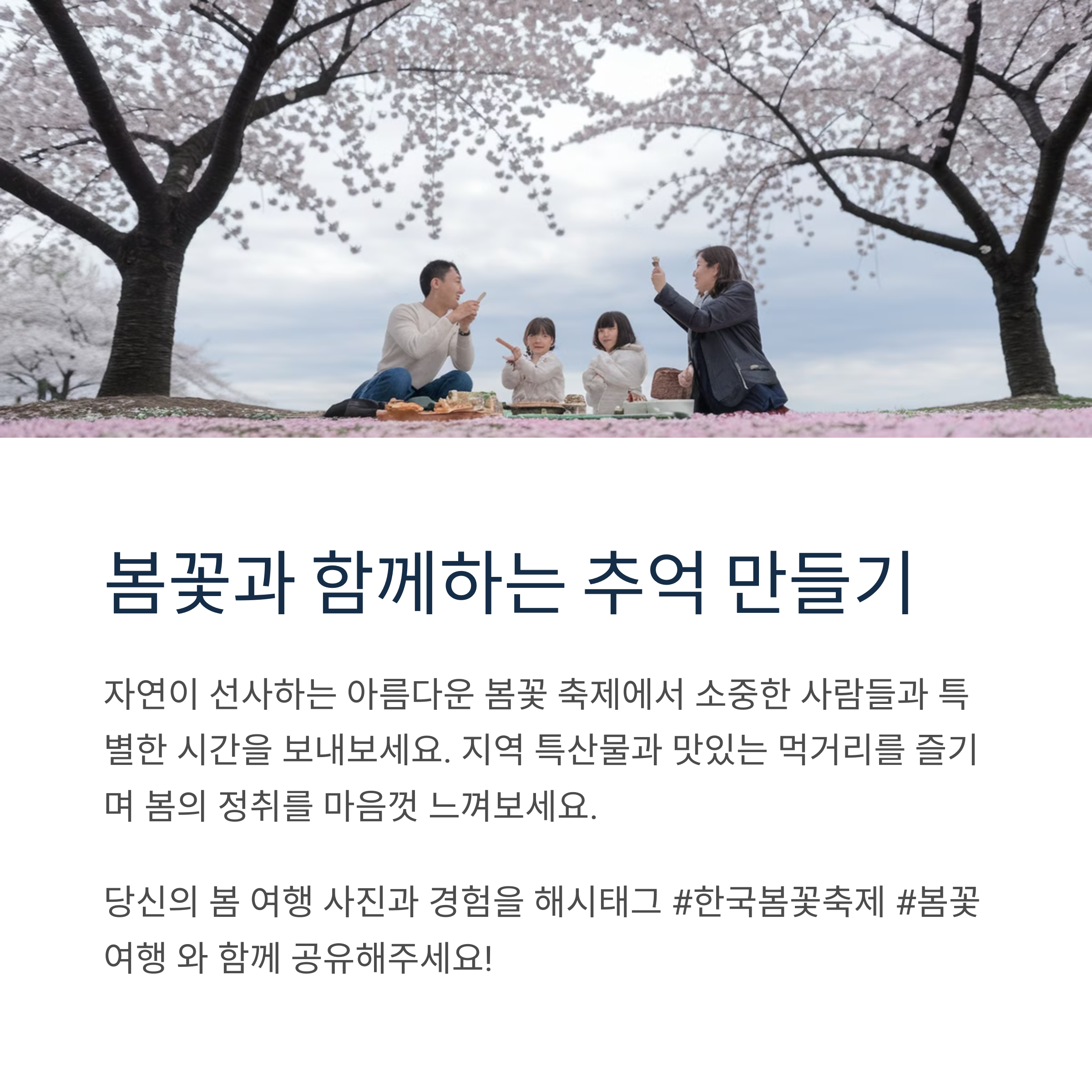 "꽃은 일주일, 추억은 일생"이라는 말처럼, 3월의 봄꽃 축제에서 잊지 못할 아름다운 추억을 만드시길 바랍니다. 갑자기 찾아온 추위에 꽃이 시들까 봐 걱정했던 마음을 뒤로하고, 완연한 봄의 기운을 느낄 수 있는 3월의 봄꽃 축제로 여러분을 초대합니다.