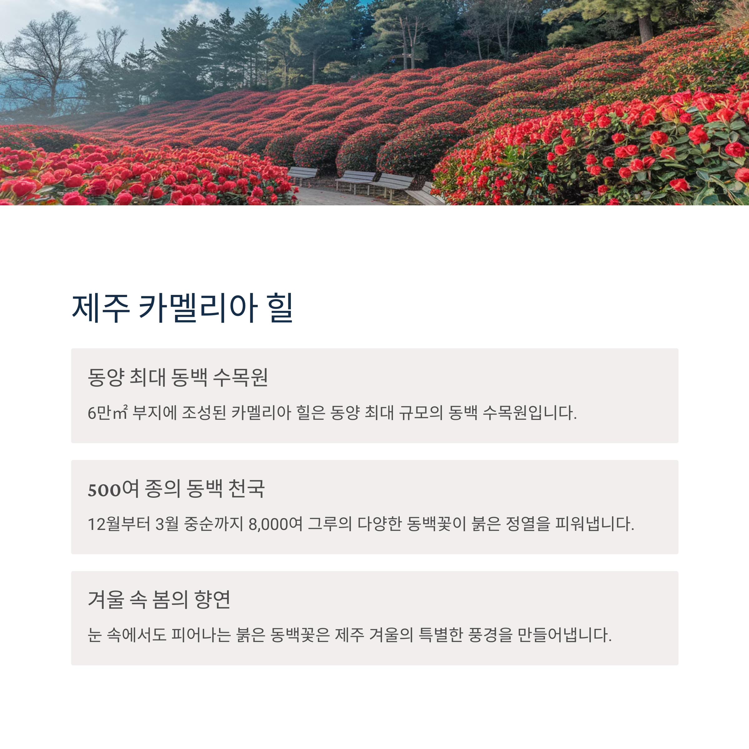 제주도 서귀포시 안덕면에 위치한 카멜리아 힐은 동양 최대 규모의 동백 수목원으로, 12월부터 3월 중순까지 약 6만㎡ 부지에 심어진 500여 종, 8,000여 그루의 동백나무가 붉은 꽃을 피웁니다. 특히 2월 말부터 3월 초가 절정을 이루며, 지난해 이 기간 동안 약 12만 명의 관광객이 방문했습니다.