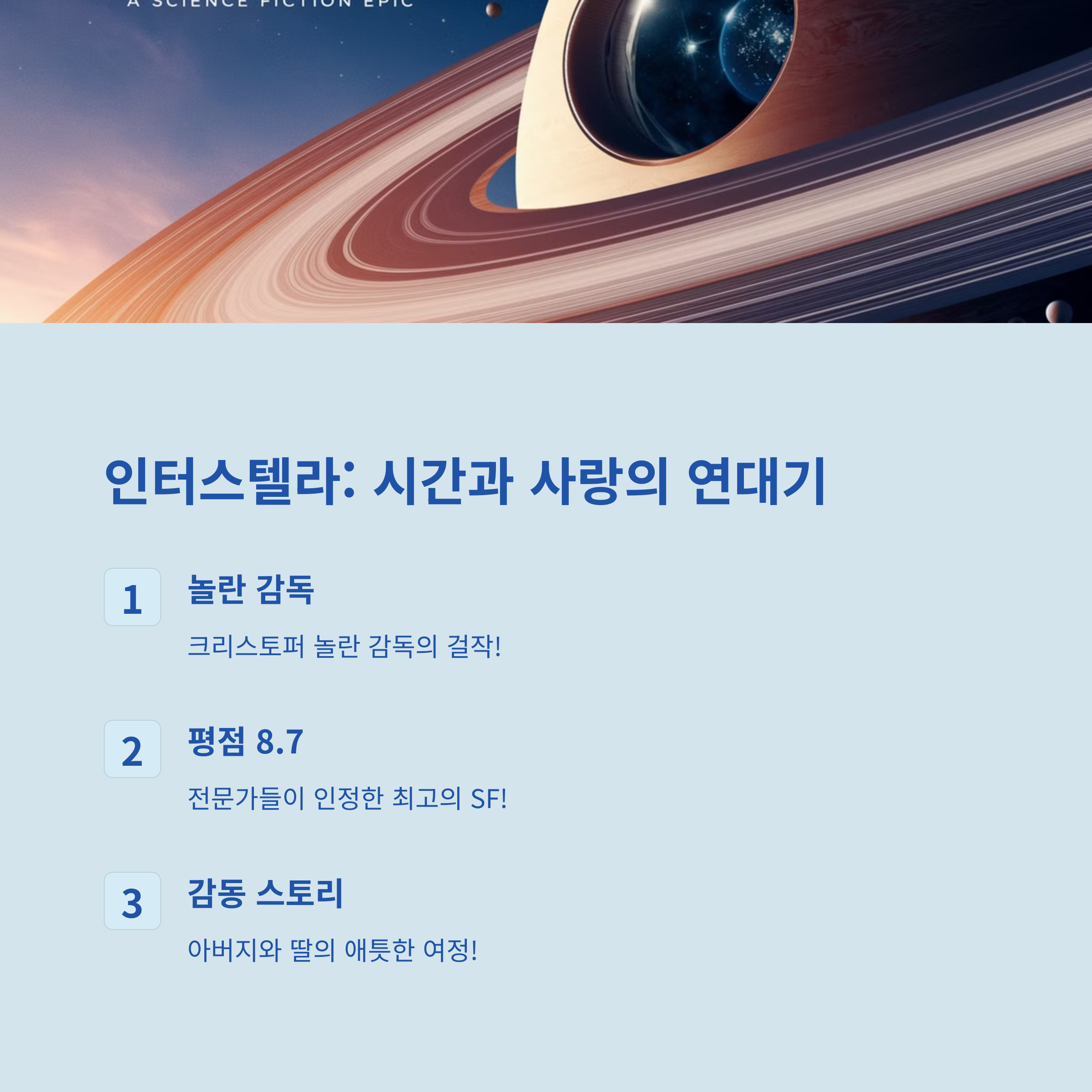 웜홀을 통해 새로운 행성을 탐사하는 과정을 그리면서, 인간의 생존과 사랑, 희망을 담아냅니다.